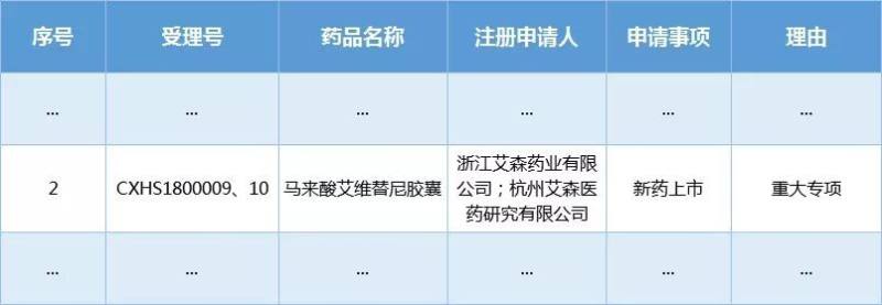 2018年8月,根据总局《关于鼓励药品创新实行优先审评审批的意见》(食药监药化管〔2017〕126号),药审中心组织专家对申请优先审评的药品注册申请进行了审核论证,其中艾森药业的马来酸艾维替尼胶囊入选理由为“重大专项”。